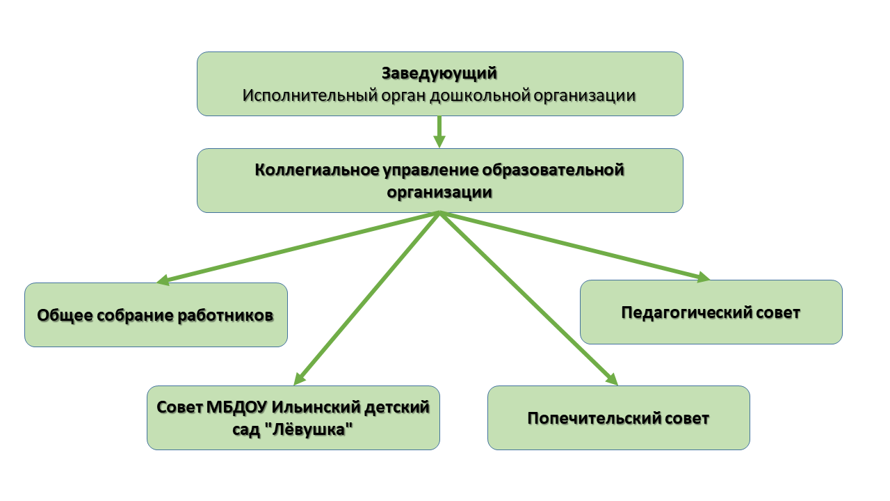 Управление Муниципальное бюджетное дошкольное образовательное учреждение "Ильинский детский сад "Лёвушка" Кувандыкского городского округа Оренбургской области" осуществляется на основе сочетания принципов единоначалия и коллегиальности.